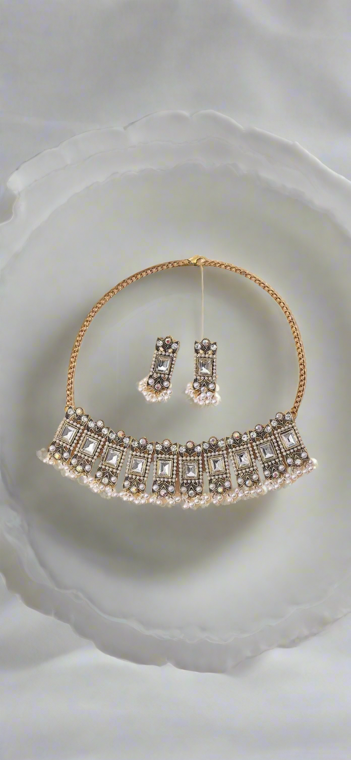 A set of three pieces including a necklace, earrings, and collar, featuring a vintage European and American bohemian style with faux pearls and gemstone accents.