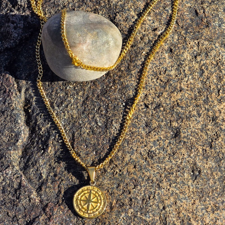 A timeless symbol of direction and purpose, this compass pendant necklace features a detailed compass rose on a polished medallion, paired with a sleek curb chain. Available in gold or silver finishes, it’s crafted from high-quality stainless steel for lasting shine and durability.