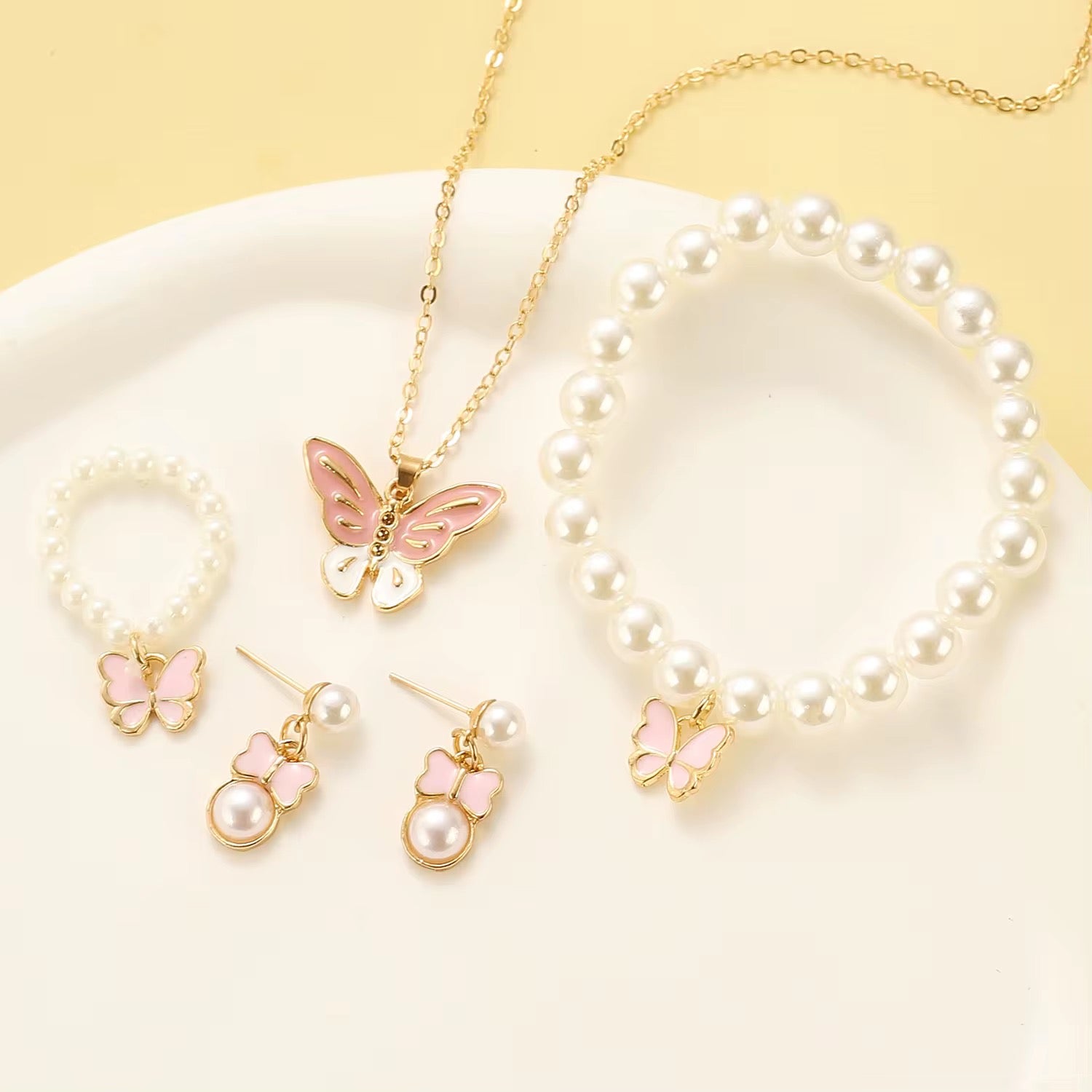 These cute butterfly-themed jewelry sets come in white, black, and pink styles. Each set includes a pearl bracelet, a butterfly pendant necklace, matching earrings with pearl and butterfly details, and a stretchy ring to complete the look.