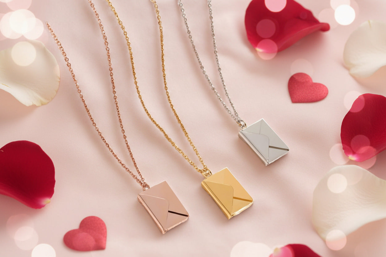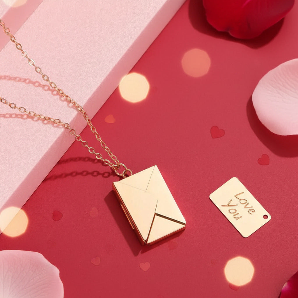 Envelope locket necklace offered in gold, rose gold, and silver. This romantic pendant with a 'Love You' secret message is an ideal gift for couples.