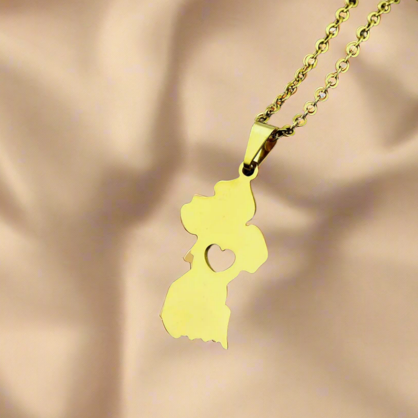 These beautiful pendants feature the map of Guyana with a solid heart in the center, available in both gold-tone and silver-tone finishes. Crafted from stainless steel with silver plating and 18k gold plating, each pendant is paired with a matching chain. Celebrate your heritage with our Guyana map necklace—wear it with pride, show your love for your country, and express your passion.