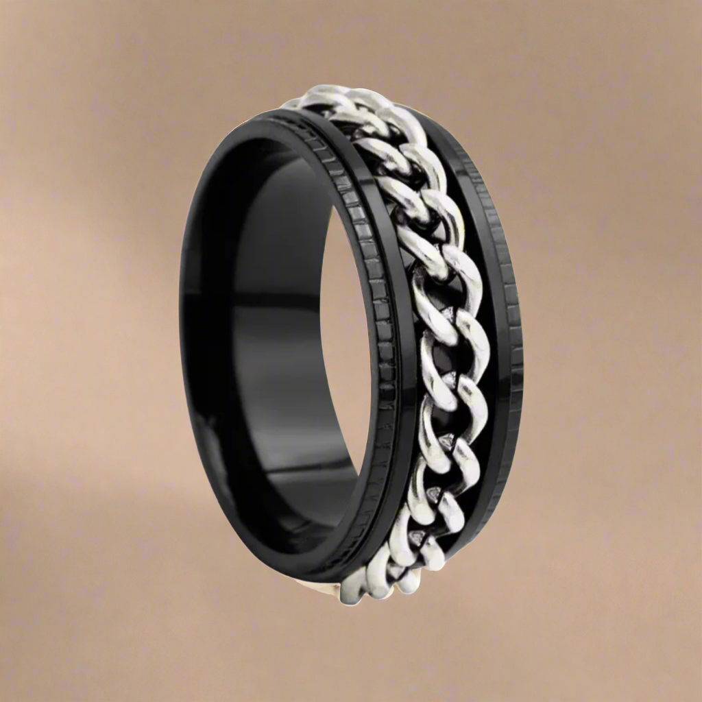 Stainless Steel Ring With A Unique Rotary Chain Detail Running Through The Center. The Ring Has A Bold, Modern Design With A Sleek Finish And Textured Edges.