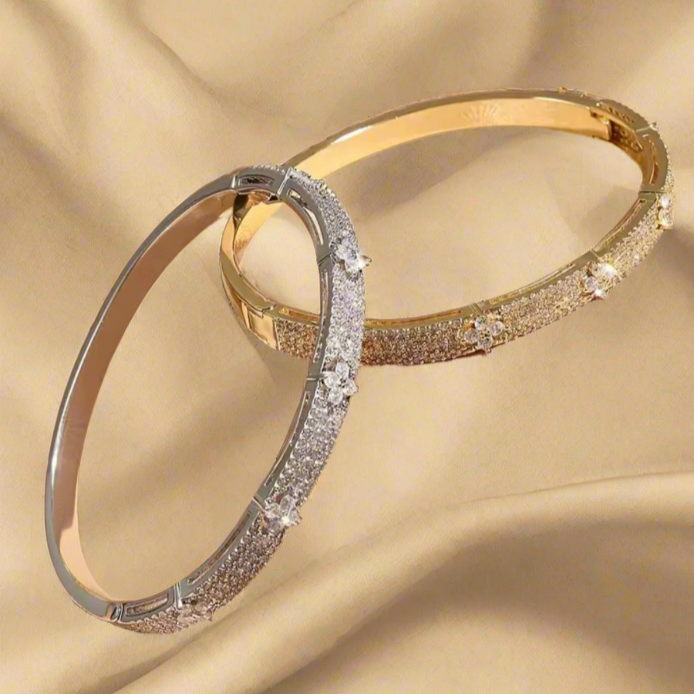 Elegant dual-tone bangles adorned with sparkling pave stones and delicate floral motifs.